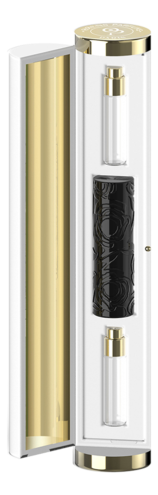 Черный флакон Callis Subtile украшен резным изображением розы — королевы цветов, которая является символом коллекции. Футляр с изысканной гравировкой изготовлен из полированного металла и декорирован кристаллом Swarovski. В футляре находится флакон парфюмерной воды 50 мл. Набор также содержит бархатный мешочек, в котором очень удобно носить флакон с любимым парфюмом в сумочке.