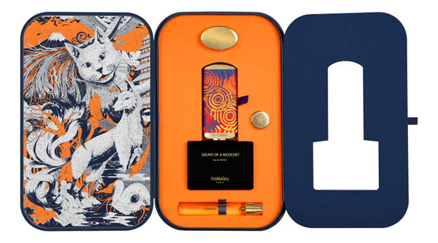 Парфюм Sound Of A Ricochet заключен в черный флакон с высоким колпачком, обтянутым голубой итальянской гранулированной кожей с изображением стрекоз. Чехол колпачка сшит вручную и может использоваться в качестве футляра для миниатюры-рефила объемом 10 мл.